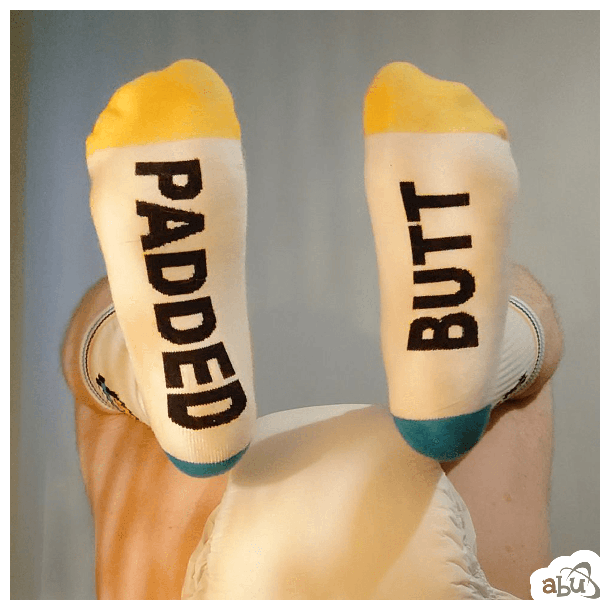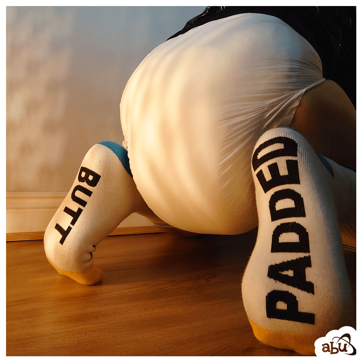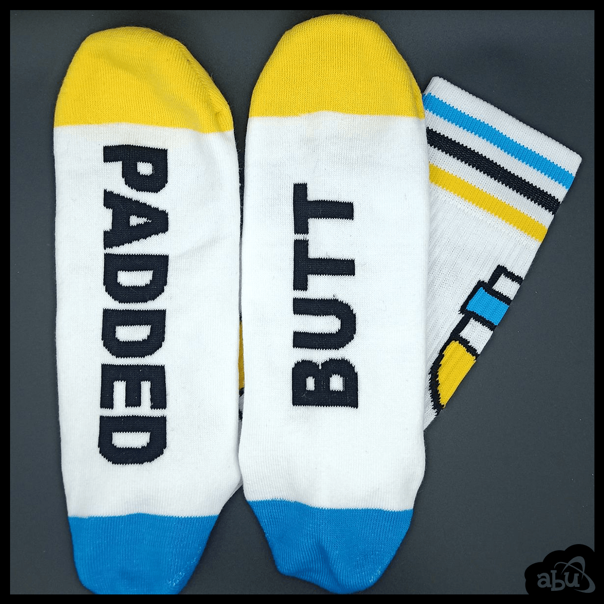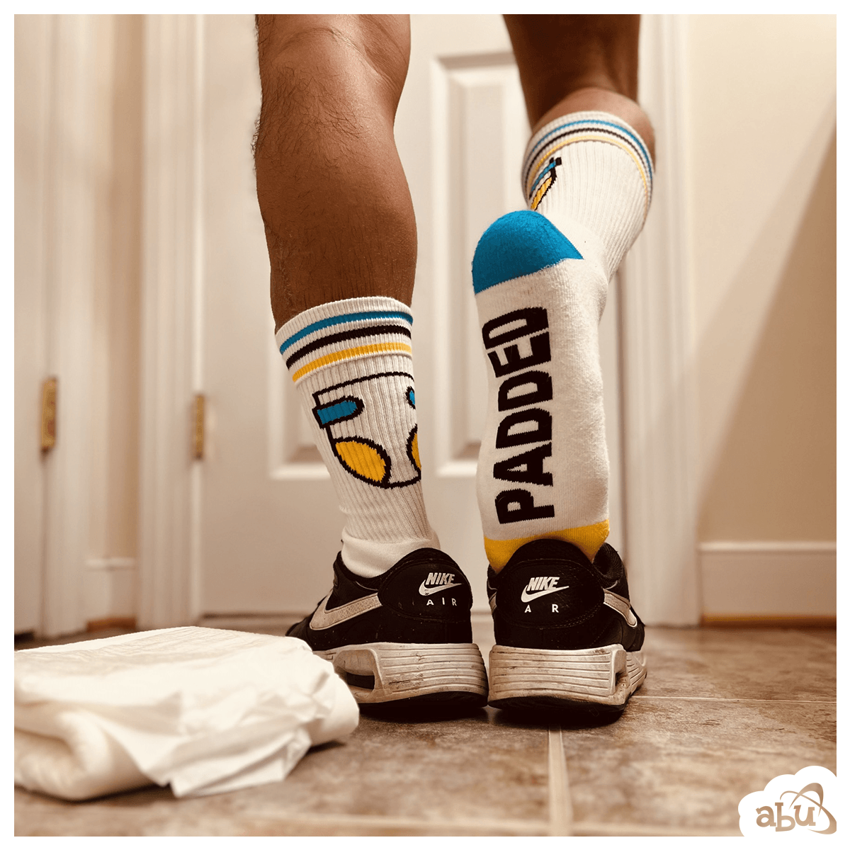 Tienen el logo del pañal en la pantorrilla y la palabra "Culito Acolchado" bordada en la suela. Con su combinación de colores azul y amarillo, son el accesorio suave y cómodo perfecto para cualquier trasero acolchado y una forma genial de presumir ante tus amigas más rizadas.