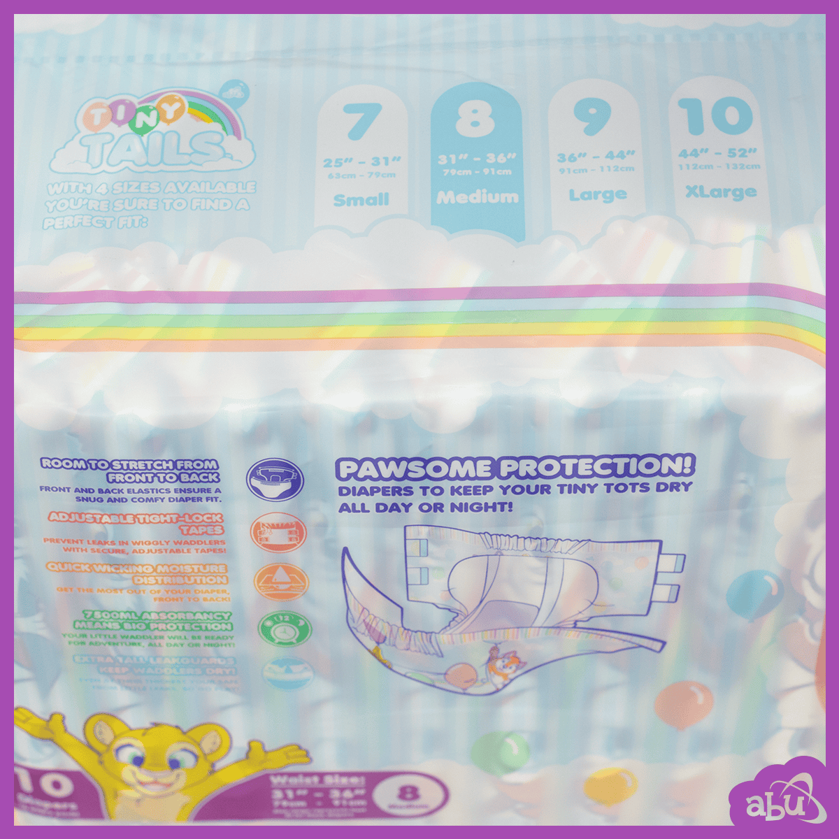 ABU se enorgullece de presentar nuestro nuevo lanzamiento: ¡un pañal con temática de peluche como nunca antes! Nos esforzamos al máximo con este producto, sin peros ni condiciones. Tenemos un pañal posicional con reverso de plástico, repleto de globos, arcoíris y delicias peludas que seguro te alegrarán la barriguita. ¡Los pañales TinyTails de ABU ya están disponibles!
